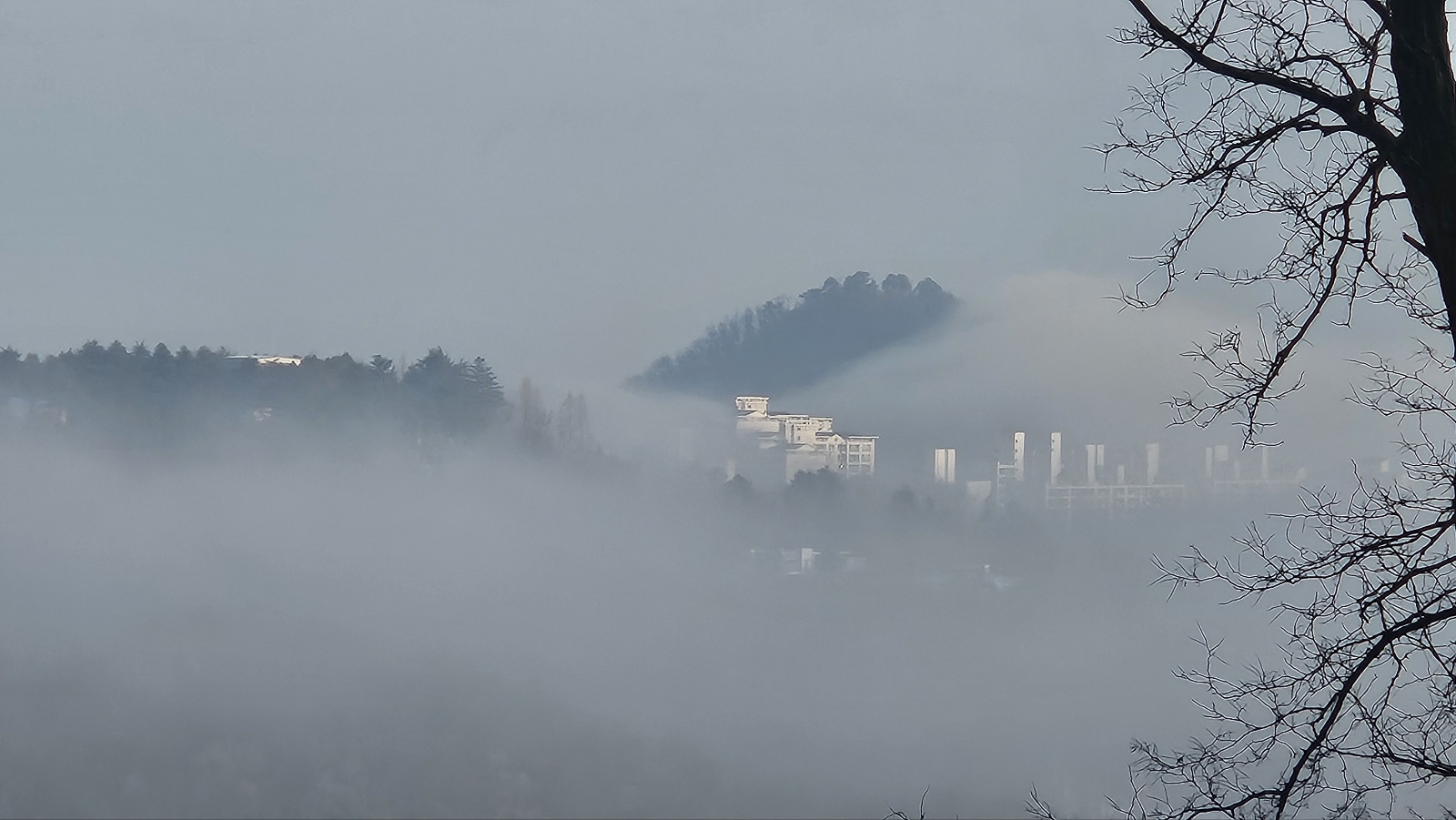안개가 창을 닦아 세상이 맑네.